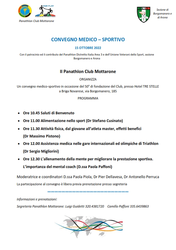 Sabato 15 Ottobre 2022, presso Hotel Tre Stelle di Briga Novarese (NO), il Panathon Club Mottarone, in occasione del 50° anniversario di fondazione, organizza un Convegno Medico-Sportivo il cui programma dettagliato è riportato nella locandina seguente.