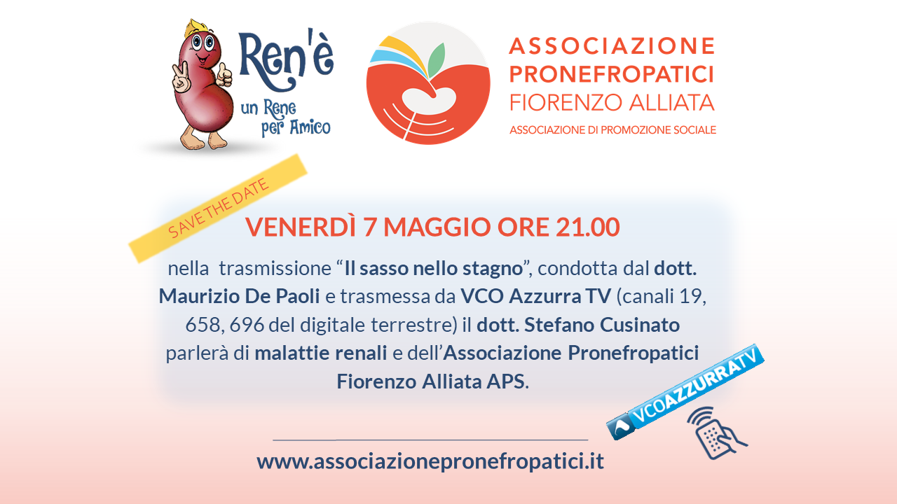 Venerdì 7 Maggio 2021 alle ore 21:00 nella trasmissione “Il sasso nello stagno”, condotta dal dott. Maurizio De Paoli e trasmessa da VCO Azzurra TV (canali 19, 658, 696 del digitale terrestre) il dott. Stefano Cusinato parlerà di malattie renali e dell’Associazione Pronefropatici Fiorenzo Alliata APS.